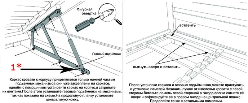 Il meccanismo di sollevamento sugli ammortizzatori a gas (ascensori a gas) è il più costoso. Tuttavia, il costo elevato è completamente compensato dalla comodità e dalla sicurezza operativa. Un sollevatore a gas opportunamente selezionato compensa completamente il carico dalla parte mobile del letto. Ciò consente anche a bambini e persone con disabilità di utilizzare il meccanismo di sollevamento senza stress. Se scegli gli ammortizzatori giusti, non sovraccaricarli durante il funzionamento, quindi la durata del suo funzionamento può essere di 10 anni o più.