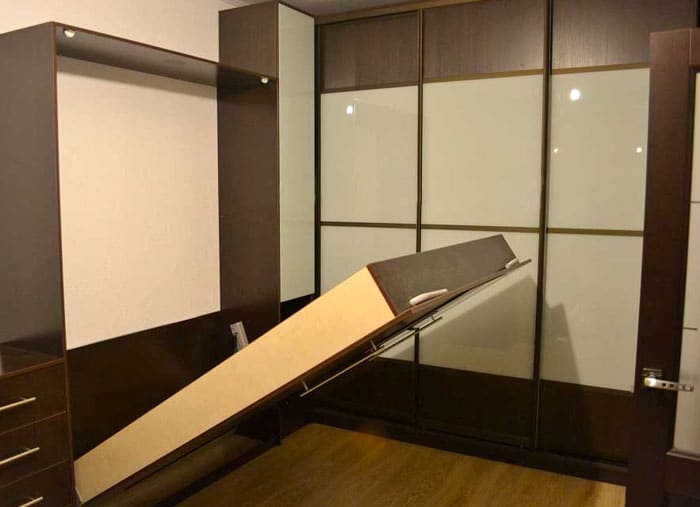 Se l'intero letto viene sollevato verticalmente, questo è un letto armadio. Ha due soluzioni progettuali che differiscono nei requisiti per il motore: