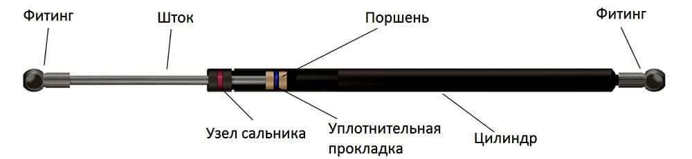 Importante! L'azoto viene utilizzato come sostanza di lavoro in un ammortizzatore a gas, pompato in un cilindro sigillato ad alta pressione. Include anche uno smorzatore dell'olio, un pistone e guarnizioni. La riparazione indipendente del sollevatore a gas senza attrezzature speciali è impossibile. Inoltre, la mancata integrità del cilindro può provocare una forte fuoriuscita di olio e parti delle guarnizioni, che può causare lesioni.
