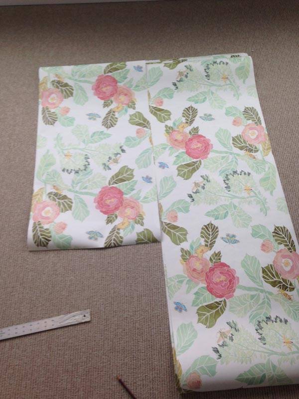 È necessario tagliare la carta da parati in modo che i motivi sulle strisce adiacenti "si pieghino" secondo il motivo. Il modo più semplice per farlo è tagliare i pezzi da più rotoli contemporaneamente. La lunghezza della striscia dovrebbe essere 5-7 cm più lunga dell'altezza della stanza.