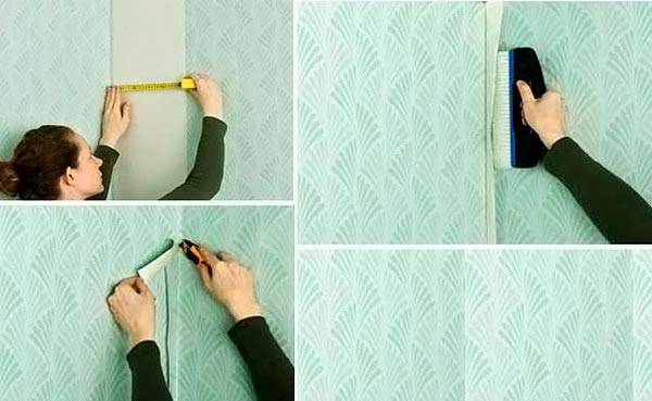 La prima striscia è incollata lungo una linea verticale. Non è così importante dove iniziare a incollare, poiché tali sfondi sono incollati end-to-end. Attacca la tela al muro, allineandola dal centro ai bordi. La verticalità è controllata da un filo a piombo. Le tele larghe si applicano meglio dall'angolo più visibile. Le tinte unite possono essere stese quando si incolla e si taglia vicino al pavimento. Il rivestimento viene arrotolato con un rullo per rimuovere aria e bolle.