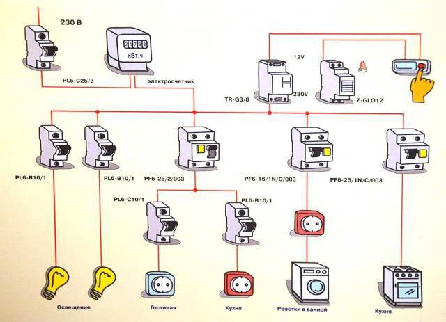 Se esegui il cablaggio dell'elettricità nell'appartamento dal cruscotto con le tue mani, devono esserci macchine automatiche, cioè interruttori di corrente automatici per un determinato gruppo di punti nella rete domestica. Quindi, per una presa, la macchina deve essere di almeno 16 A, la sezione del filo ad essa collegata è di 2,5 mm². Una macchina da 10 A dovrebbe essere responsabile dell'illuminazione, del cavo ad essa collegato e dei dispositivi di illuminazione - 1,5 mm².