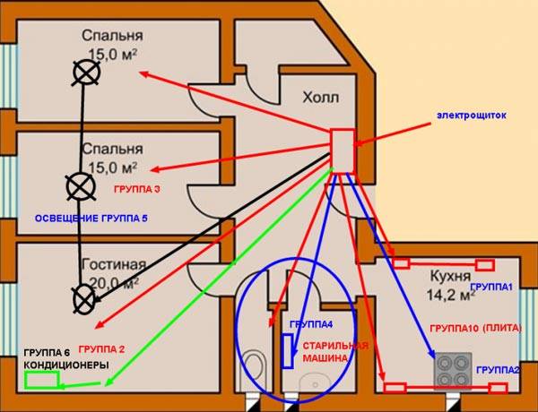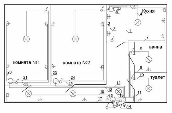 È necessario portare il cavo principale dal centralino, che si trova sulla scala, viene portato nella scatola di giunzione o nel centralino, che si trova direttamente nell'appartamento, e da esso eseguono il cablaggio in tutti i punti delineati nel piano.