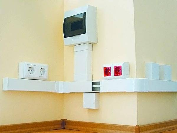 Inizialmente, il cablaggio viene posato sulla superficie delle pareti e del soffitto senza rientranze, quindi è nascosto in scatole di dimensioni appropriate. Se ci sono soffitto battiscopa e loro larghezza consente di nascondere la scatola sotto di loro, quindi in questo modo sarà possibile implementare il cablaggio nascosto, che può essere raggiunto in qualsiasi momento con una perdita minima aspetto interno.