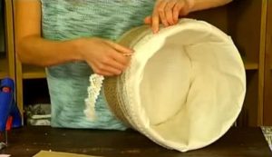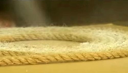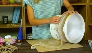 - Una corda è attorcigliata su una base di legno, per questo è necessario incollare l'estremità del filo al centro e avvolgere la corda, incollandola gradualmente.