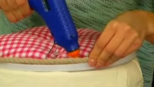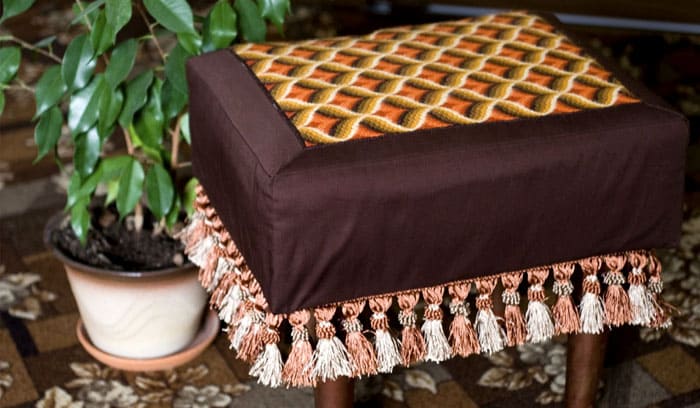 Se in casa ci sono diversi vecchi sgabelli, non puoi correre per uno nuovo, ma usa uno spazio vuoto e crea un pouf chic. La base è ritagliata dal tessuto, imbottito con imbottitura in poliestere. Puoi usare una federa lavorata a maglia, un denim o qualsiasi altro tessuto in casa.