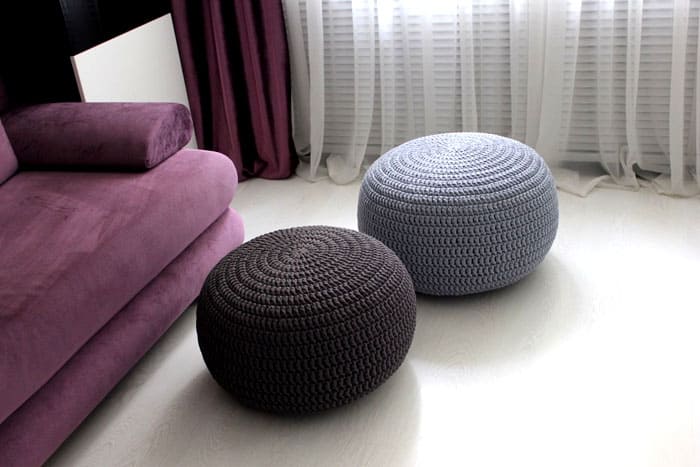 Un'opzione comune oggi è un pouf rotondo all'uncinetto. Puoi anche usare grandi bottiglie di plastica o cartone come base. Una sedia morbida è imbottita con vecchi stracci, imbottitura in poliestere o altri materiali, ma è importante tenere in considerazione la forza del filo.
