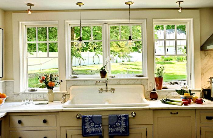 - Il modello del lavello sembra originale in cucina vicino alla finestra. Questa disposizione ti permetterà di guardare i bambini che camminano nel cortile durante il lavoro.
