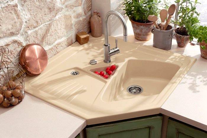 Il lavello ad angolo per la cucina non è solo un ottimo arredo d'interni, ma anche un design che permette di sfruttare al meglio l'area. Il modello è consigliato per stanze piccole. Le strutture angolari possono essere integrate o sospese. Aiutano a risparmiare spazio. La ciotola più conveniente è una ciotola rettangolare, ma una configurazione rotonda viene spesso utilizzata nei prodotti angolari. Il numero di ciotole varia da 1 a 5.