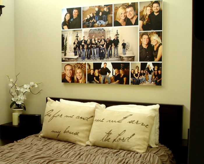 In camera da letto, puoi creare collage dalle foto dei tuoi paesaggi preferiti. La bellissima natura, le immagini succose hanno un effetto molto pacificante sulla psiche. Anche le foto di famiglia stanno bene qui, addormentarsi e svegliarsi, vedrai i volti dei tuoi cari.