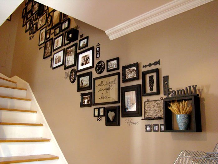 In questo caso, le immagini devono essere fissate in modo che si trovino a una distanza di un metro e mezzo dai gradini. Accade così che il collage ripeta i passaggi le scale, come se la picchiasse. È importante che la distanza tra le foto sul muro sia la stessa.