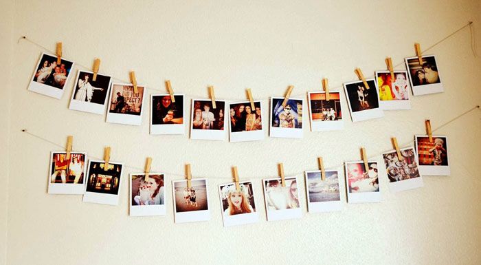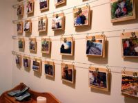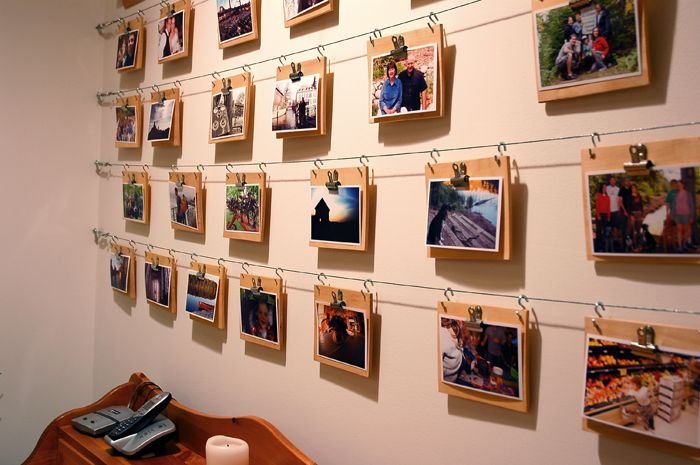 Se trovi noiosi questi esempi, dai un'occhiata alle soluzioni creative degli stilisti. Per una foto sul muro, puoi usare corde sospese, mollette e molto altro che puoi trovare in ogni casa. Il prezzo di un tale design è economico e l'effetto è sorprendente.