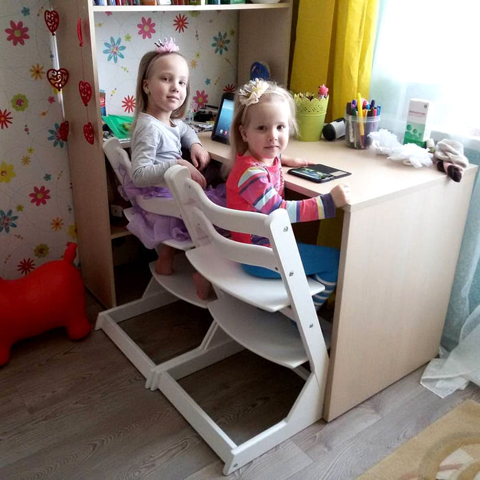 Queste sedie sono adatte per bambini dai 6 mesi di età e vengono prima impostate all'altezza massima e poi gradualmente abbassate. Il vantaggio è che il bambino si sente come un partecipante a pieno titolo alla cena e si siede alla stessa altezza degli adulti. Inoltre, può tranquillamente mangiare o giocare.