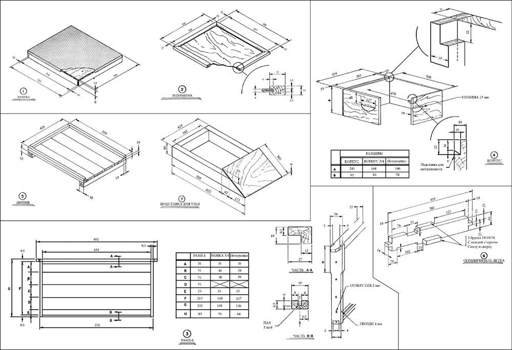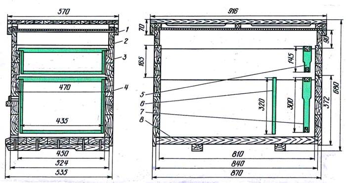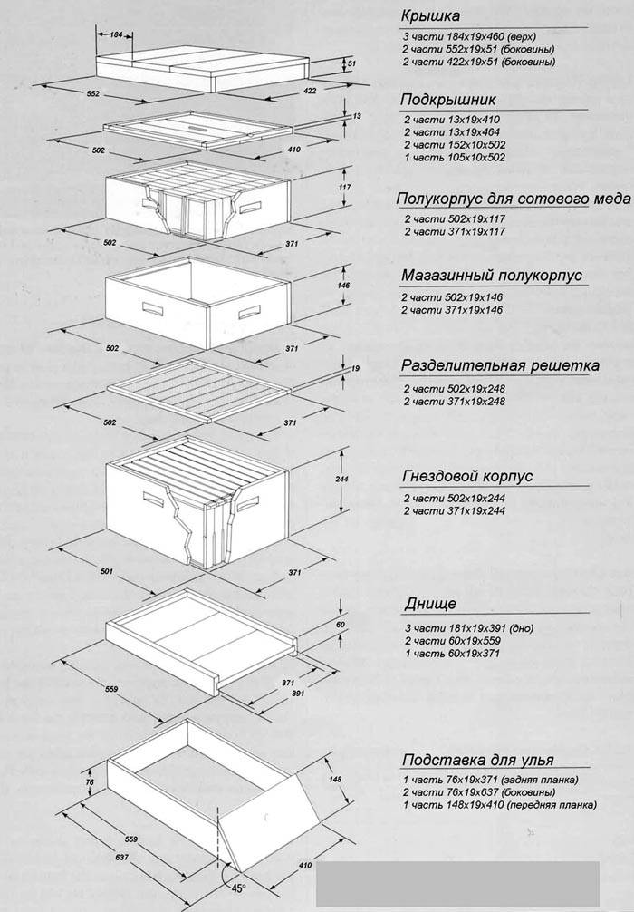 Da questo disegno dell'alveare Langstroth con due riviste, puoi studiare non solo le dimensioni, ma anche la sequenza di assemblaggio