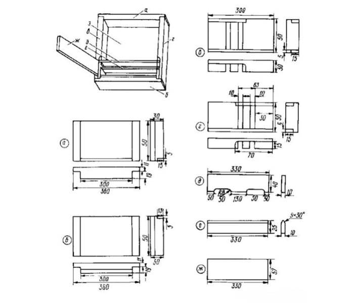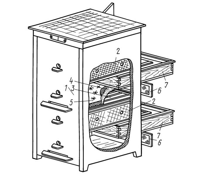 - La parte principale è il corpo (3). In questo progetto vengono installati due elementi identici. È qui che l'utero depone le uova. Per rendere più facile mantenere una temperatura confortevole, le pareti sono rese più spesse o viene montato uno strato aggiuntivo di materiali porosi. I telai sono posizionati all'interno in modo che ci sia spazio sufficiente per la pulizia nella parte inferiore.