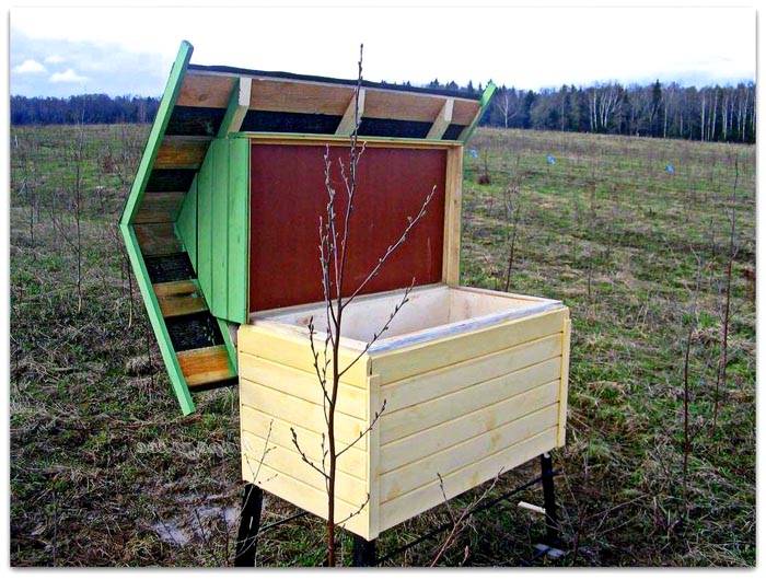 - Il tetto non deve essere piatto. Questa opzione è adatta per l'organizzazione di apiari nomadi. Se si fanno una o due pendenze, le gocce di pioggia vengono rimosse più velocemente dalla superficie del tetto.