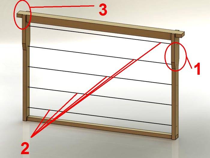 La forma speciale dei pannelli laterali con l'espansione della parte superiore (1) aiuta a creare spazi di una certa dimensione durante l'installazione dei prodotti nell'alveare. Le corde tese tra loro (2) fatte di filo da pesca o filo di acciaio facilitano la costruzione dei favi. Gli elementi allungati della traversa (3) poggiano sulle pareti dell'alloggiamento durante l'installazione.