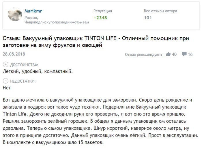 È un dispositivo portatile semplice e compatto per il confezionamento sottovuoto di prodotti. Può funzionare sia da una rete di alimentazione a 220 V, sia da 6 batterie. Il confezionatore necessita di speciali sacchi con valvola per funzionare, che possono essere acquistati separatamente. Ci sono sia materiali di consumo dal produttore che controparti più economiche dalla Cina. Puoi acquistare questo modello per 1250 rubli.