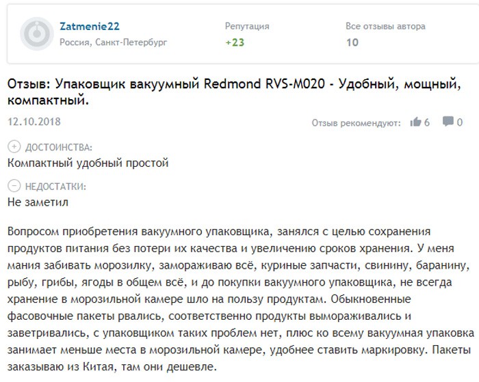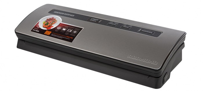 Una macchina per sottovuoto semplice e molto funzionale per la casa, che può essere acquistata per 5.000 rubli. Il corpo è in plastica intervallata da metallo. La velocità di pompaggio dell'aria è di 12 l / min. La lunghezza massima del nastro termico è di 30 cm Il dispositivo è controllato elettronicamente, tramite pulsanti a membrana. Dalla funzionalità della confezionatrice sottovuoto Redmond, vale la pena evidenziare la possibilità di lavorare con contenitori sottovuoto speciali, per i quali esiste un tubo speciale. Puoi anche scegliere il tipo di prodotto utilizzato: umido o secco. Per il modello della confezionatrice sottovuoto Redmond RVSM020 sono disponibili speciali sacchetti di imballaggio del produttore, che, in generale, possono essere sostituiti con analoghi.