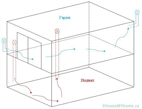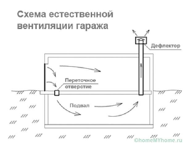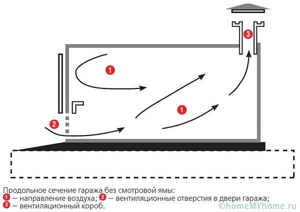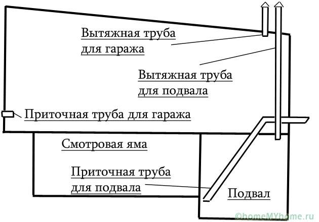 A causa del funzionamento periodico di questo edificio, è preferibile una ventilazione naturale non volatile tramite prese d'aria o condotti d'aria. Quando si progetta la ventilazione nel garage con le proprie mani, il diagramma e la foto potrebbero differire leggermente a seconda della presenza di un sottosuolo cantine per ortaggi.