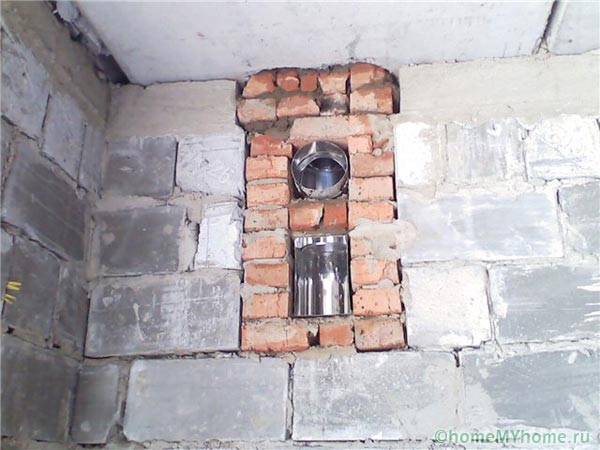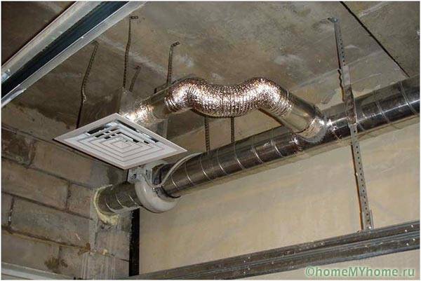 - naturale - un ingresso a livello di 15 cm dal pavimento, una cappa di scarico alla stessa distanza dal soffitto, al suo interno è inserito un tubo di diramazione, collegato a un tubo che sale sopra un tetto piano o il colmo di un tetto a falde di 50 cm;