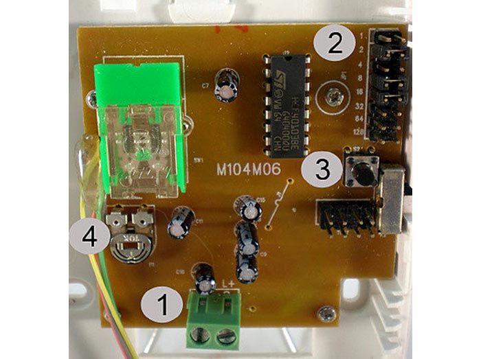 Ciò accade quando una linea di due fili viene disegnata nell'appartamento e l'accesso al canale centrale è limitato. La foto mostra gli interruttori DIP (2, 3). In essi sono installati dei ponticelli che impostano la codifica durante la trasmissione delle informazioni. La presenza di tali elementi indica che la tecnologia digitale è di fronte a te.