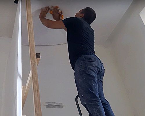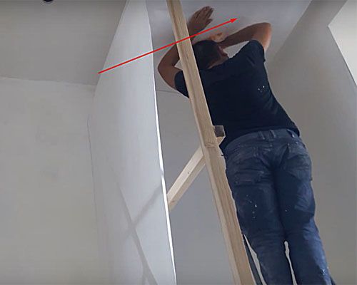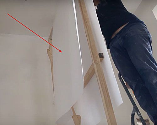 Основният проблем при поставянето на тавана е, че платната са склонни да падат под собственото си тегло. Те трябва да бъдат залепени на етапи.