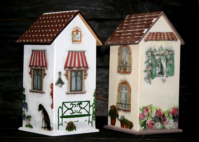 Те украсяват сгради от шперплат с шпакловка за дърво, декупаж или просто боядисват грундирания продукт.