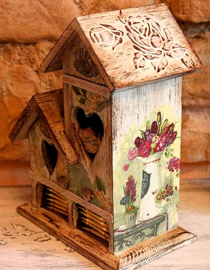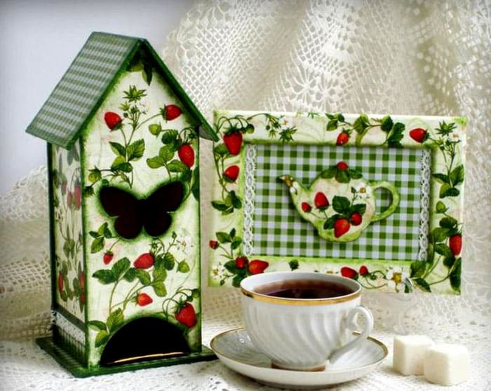 Няма начин да се броят методите за декорация. В зависимост от основата се избира материалът за декора, например занаятите от картон и шперплат най-често се украсяват с карти за декупаж за чаени къщи. Красиви салфетки с всякаква тема също са включени във входа, толкова е лесно да украсите новогодишната чайна или да направите продукт в стил шаби шик и Прованс. В допълнение към декупажа, те използват шпакловка, полимерна глина, елементи за скрапбукинг, дантели, мъниста, дървени шарки и много други.