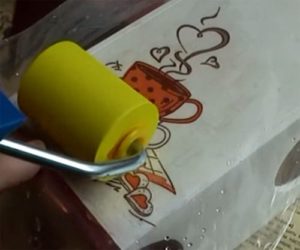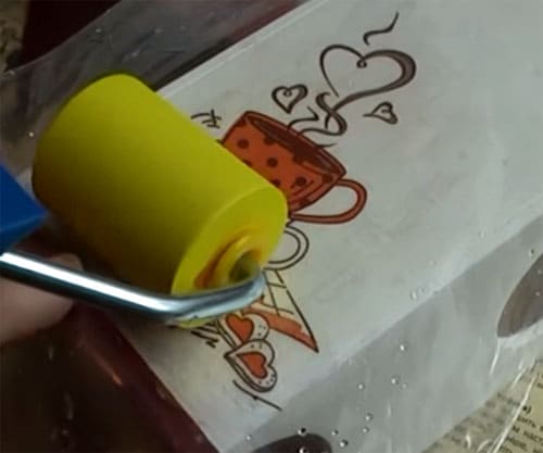 Първо обработваме занаята с акрилен грунд. Веднага след като почвата изсъхне, ние продължаваме да творим. На мястото, където ще бъде разположен чертежът с желания размер, се нанася PVA лепило, за предпочитане смесено в равни пропорции с вода. Сега картината, откъсната от салфетката, се поставя върху филма с лицето надолу. Можете да направите готови снимки за декупаж с тема за чай.