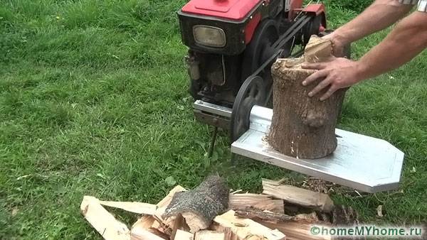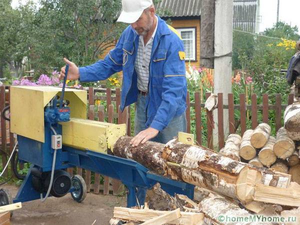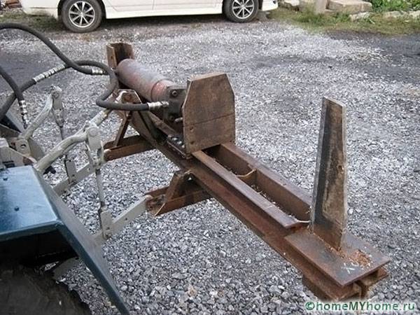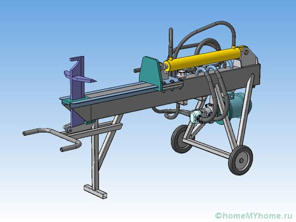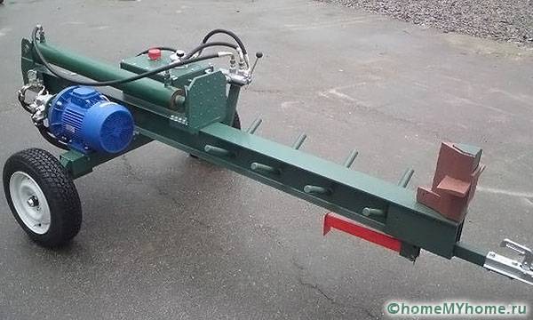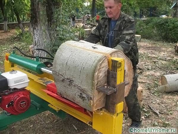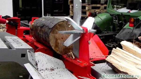 Това устройство работи според принципа хидравлична преса... Хидравличният цилиндър избутва дървения труп върху заточен клин, който разделя дървото. Тези дървосекачи се задвижват от маслена помпа, задвижвана от бензинов или дизелов двигател. Основният им недостатък е високата цена на висококачествените хидравлични цилиндри, блокове за управление и помпи.