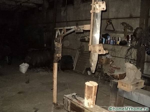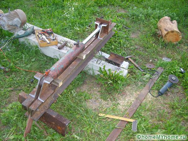 Направете рамка от I-лъч или U-лъч. Колкото по-широк е лъчът, толкова по-голямо натоварване ще издържи рамката и толкова по-трудно ще бъде транспортирането на дърворезката.Следователно, оптималната ширина на гредата е 10–15 см. Прикрепете хидравличния цилиндър над гредата на височина 5–7 см и монтирайте тласкач от ламарина с дебелина 7–10 мм в края на пръта. Направете тяло за ножа, така че да може да се движи около леглото.