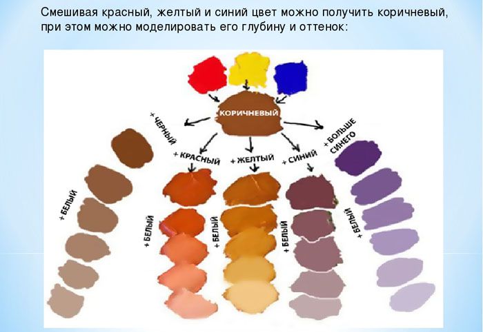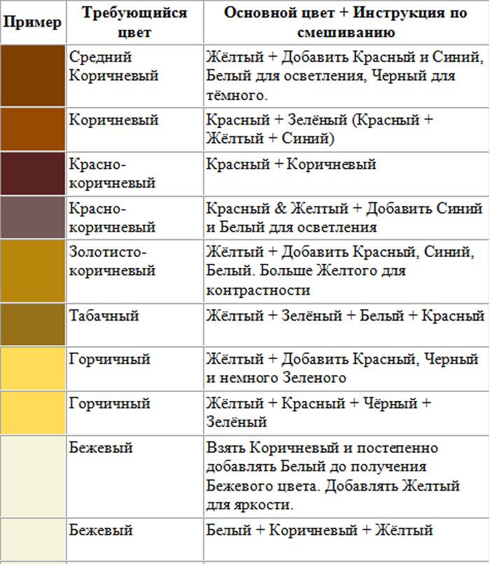 Основни тонове: червен, син и жълт. Ще разберете как да ги смесвате във всякакви пропорции по-долу: можете да получите няколко нюанса на кафявото.