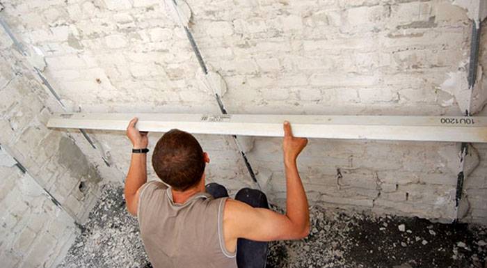 Процесът на подготовка на повърхността за мазилка започва с почистване на основите от предишни покрития. След това нивото трябва да определи размера на отклоненията, за да се определи дали монтаж на маяци или можете да се справите без допълнителна работа.