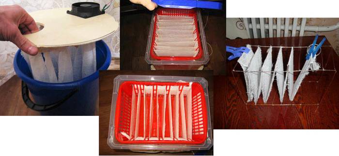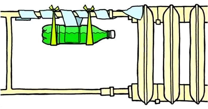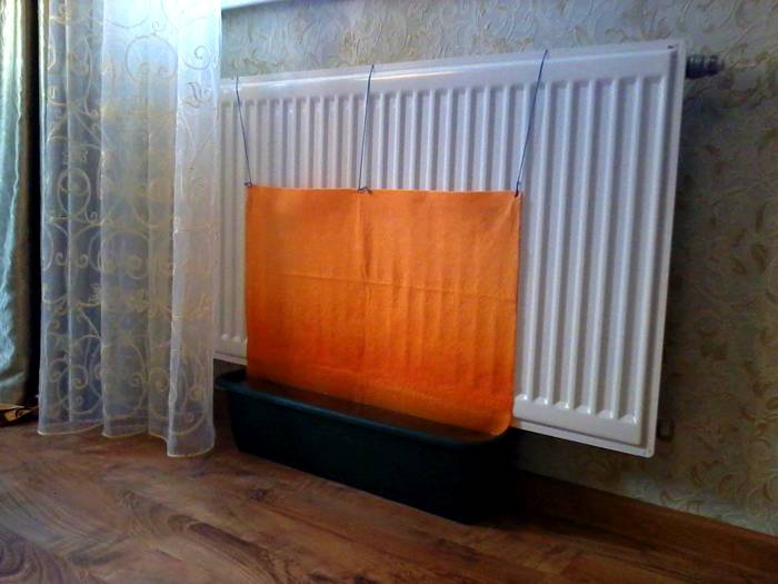 Като алтернатива можете да навлажните кърпа и да я поставите върху батерията. Материята ще се нагрее и течността ще се изпари и ще влезе във въздуха. Можете да измислите обикновен овлажнител за превръзка. За да направите това, водата се излива в контейнера и върху батерията с единия край се поставя мокра превръзка, а с другия - в буркан с вода. В този случай частта от батериите ще изсъхне, а другият край на превръзката ще абсорбира вода от контейнера.