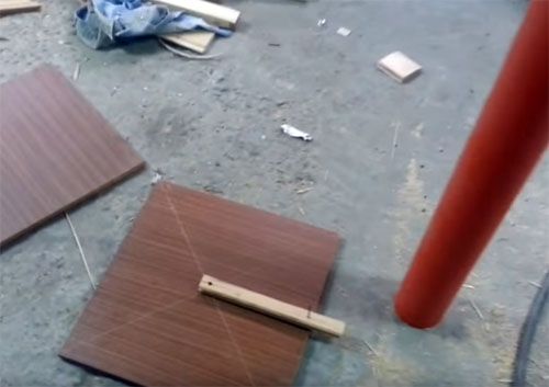 Най-трудното строителство: готвач шперплат лист, ПДЧ листове или MDF, няколко PVC тръби с диаметър 100 mm, самонарезни винтове, отвертка, мозайката, всякакви компаси, подходящи за размера. И така, как да направим надраскване за котка с игрален комплекс, ние работим със собствените си ръце. Снимката показва процеса на работа.