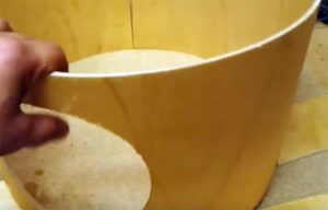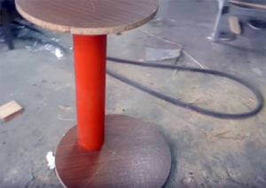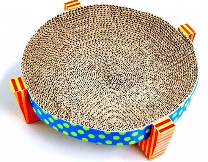 Кръгът трябва да е с диаметър най-малко 45-50 см, въз основа на средно големи котенца. За стабилността на картонената купа краката се правят чрез изрязване на желаната форма и залепване на елементите. Отвън стържещият стълб е украсен с плат или лепилен филм. За по-сложни форми ще ви е необходимо умението да боравите с инструмента за сглобяване и способността да проектирате. Процесът е ясно представен във видеото.