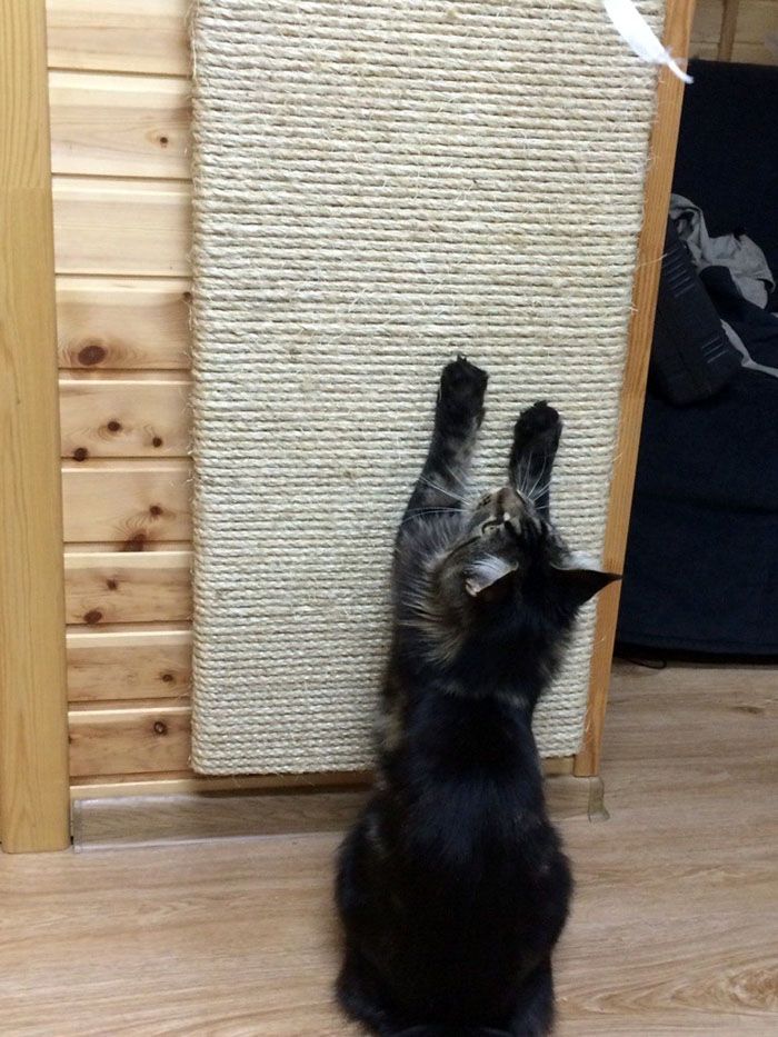 Драскащият стълб не е прикрепен към гола стена, а към дървен панел. Ширината може да бъде всякаква, а в идеалния случай височината трябва да бъде два пъти по-голяма от дължината на котката без опашката.
