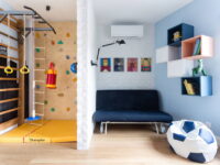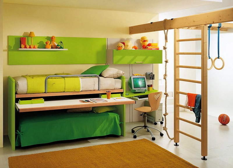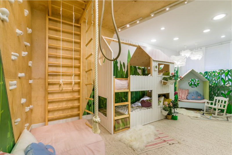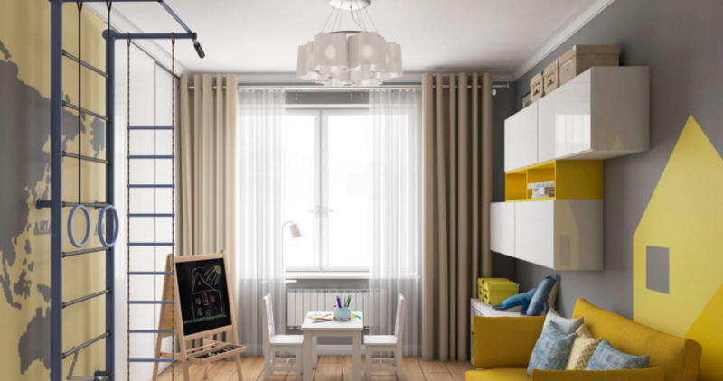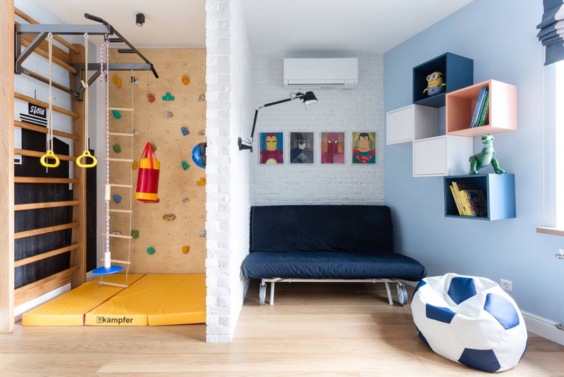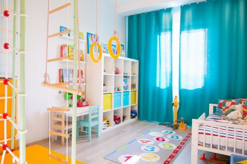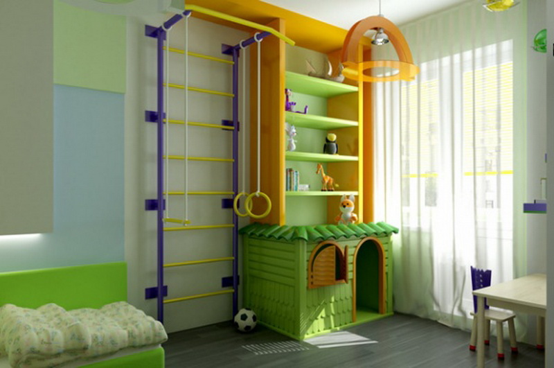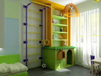 Те не пречат на интериора на стаята на детето, макар и само защото практически не заемат място. Шведската стена и стената за катерене са прикрепени директно към стената. В този случай е по-добре да освободите пространството на пода, за да можете да играете с топката.