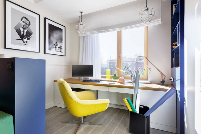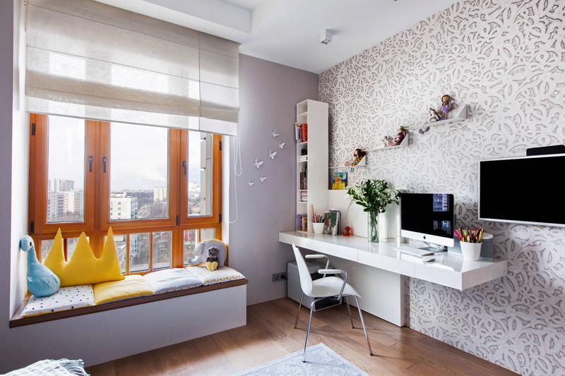 Най-добрата зона е близо до прозореца. Например плотът от стена до стена ще бъде удобен. Това ще създаде удобно пространство, което може да бъде разделено на две: за учене и за забавление.