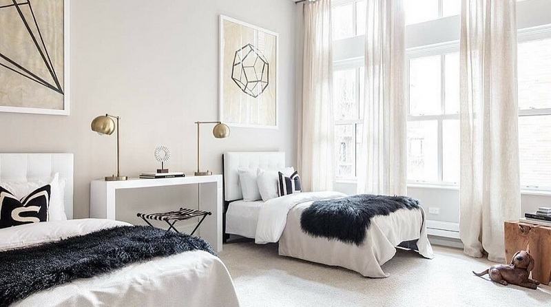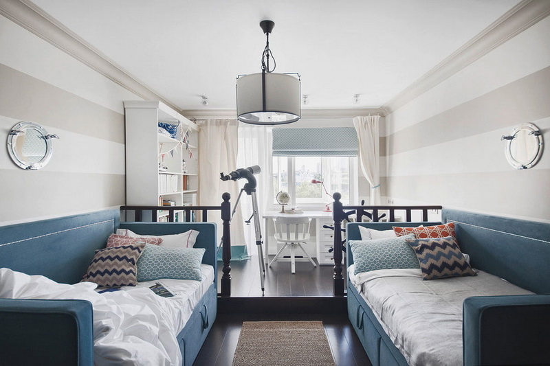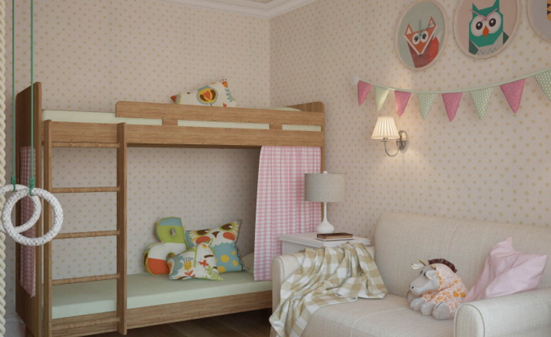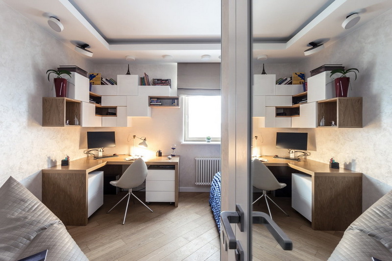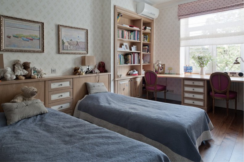 - Сдвояване. Подходящ за деца на същата възраст. Възможно е да си купите двуетажно легло, двойни маси и мебели. Тук е подходящ един симетричен дизайн, тъй като учениците ще имат същите хобита.