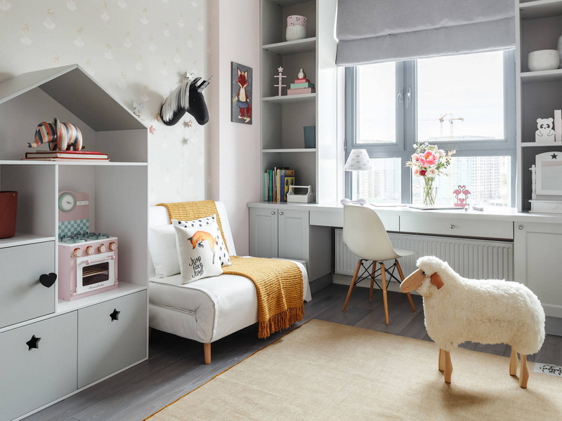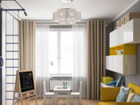 Дизайнът на детска стая за ученик в начално училище задължително включва зона за игра. Можете да го оборудвате в 2 форми: