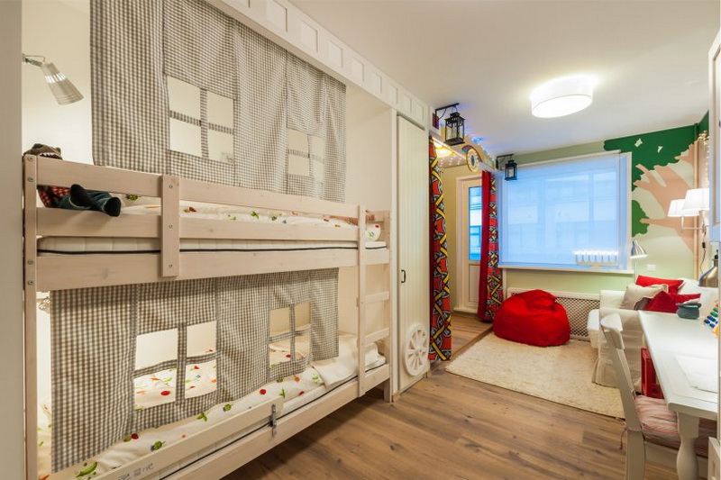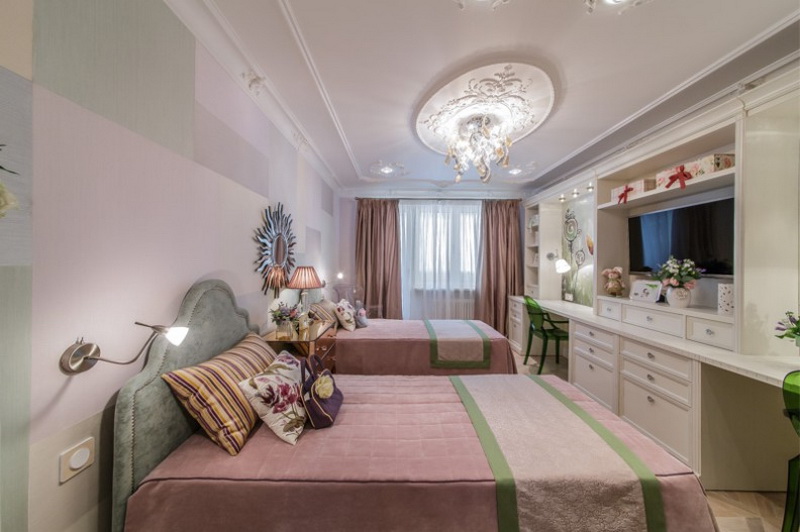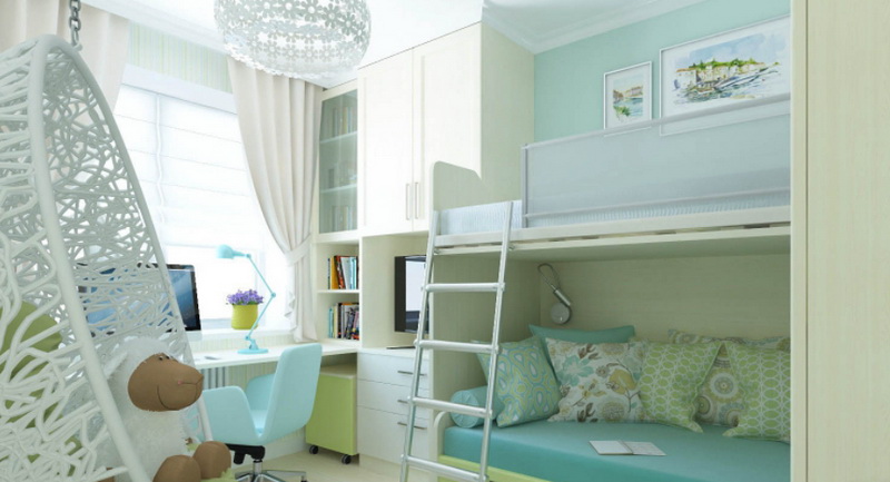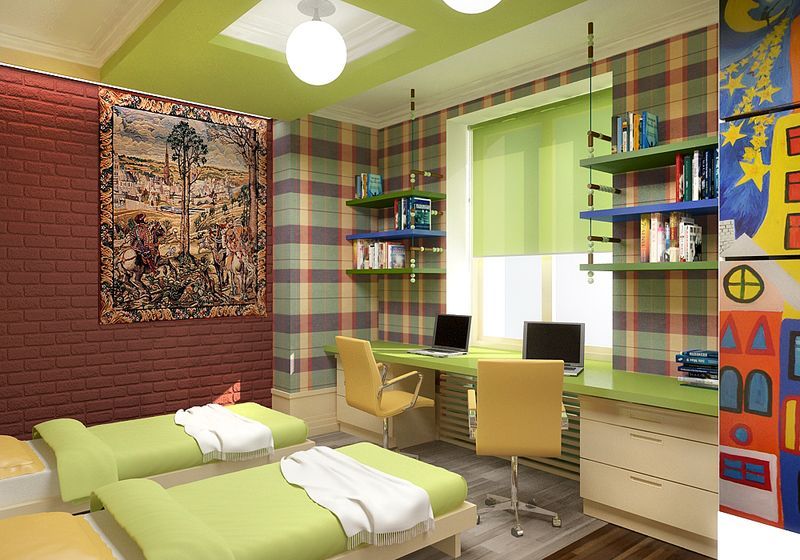- Хетерогенност. Подходящ за деца от всички възрасти. В този случай е по-добре да разделите стаята на две. В същото време площта се разпределя според нуждите. Маса и легло са достатъчни за тийнейджъри, когато учениците от началното училище често играят на пода. Тук вече са необходими отделни маси и легла, както и шкафове за съхранение на дрехи. По-добре е да заемете повече място на рафтовете.