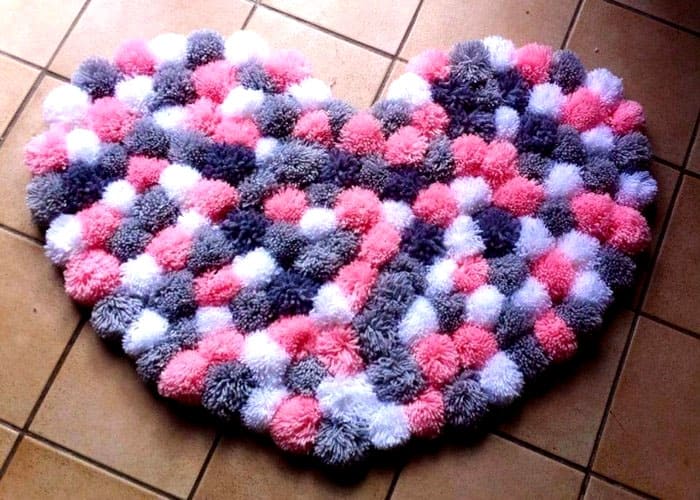 Сърдечен продукт за крака и душа е направен от мека пяна от PVC килим и красива прежда. Работата се извършва по същия начин, както при кръглия килим: първо, върху основата се изчертава форма на сърце и се изрязва. След това започват да правят помпони.