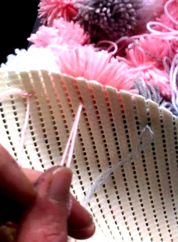 Pom-poms също са обвързани с мрежата, както в квадратната версия от шевообразната страна на продукта. Работата започва от центъра, движейки се в една посока.