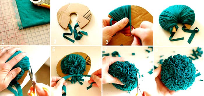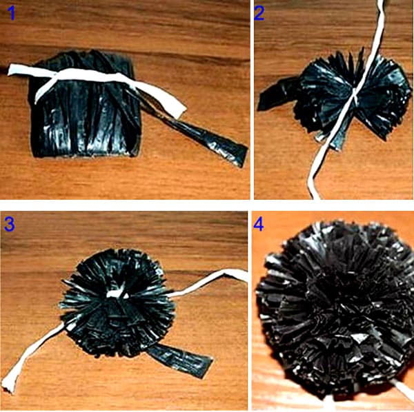 Вече видяхме как се правят килимите от прежда, но можете да направите и помпони от други материали: козина, плат и найлонови торбички.