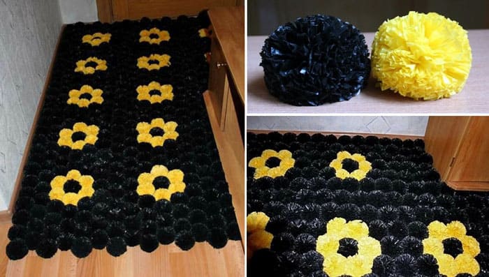 Икономичен и спретнат килим е направен от многоцветни найлонови торбички. Ако се замърси, можете да го измиете, подсушите и да го върнете на място.