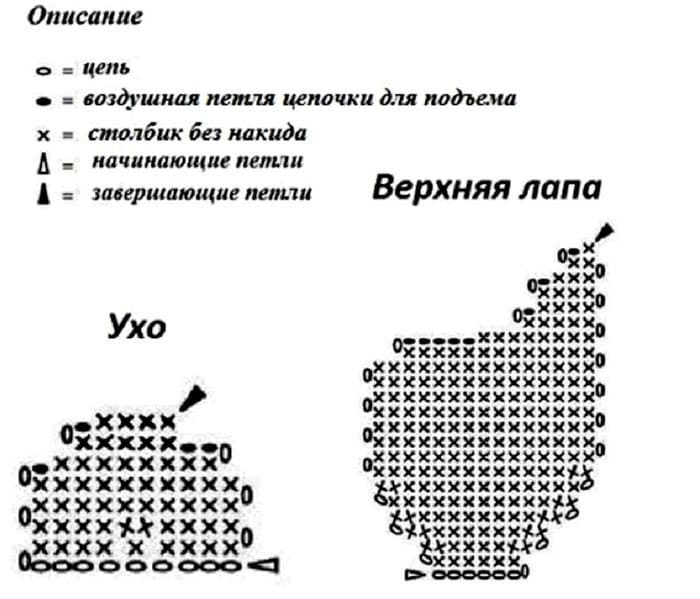 - ушите са плетени на една кука, използвайки техниката на единично плетене на една кука;