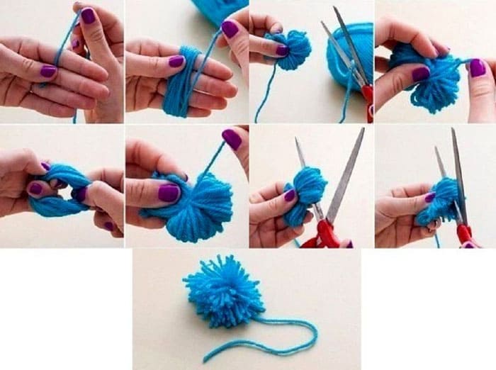 Има няколко начина да направите пухкави топки. В първия случай трябва да вземете преждата и да я навиете около средния и показалеца на едната ръка. След навиване на достатъчно слоеве, трябва да опънете нишка между пръстите си, която ще пресече бримките в средата. С тази нишка издърпваме всичко на руло. Примките се отстраняват от ръката и се изрязват от всяка страна с ножици, струните се изправят и избутват. Помпонът е готов!