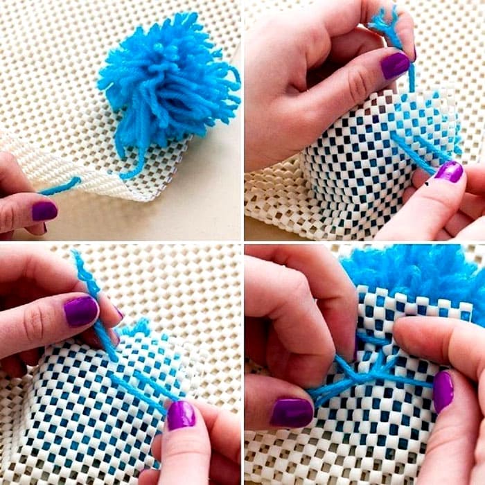 Бавно издърпайте всеки елемент, като поставите малко пълнител вътре. Вътре е поставена и лента, която ще служи като връзка между основата на килима и помпона. Конецът се изтегля до края, като го закрепва към лентата.